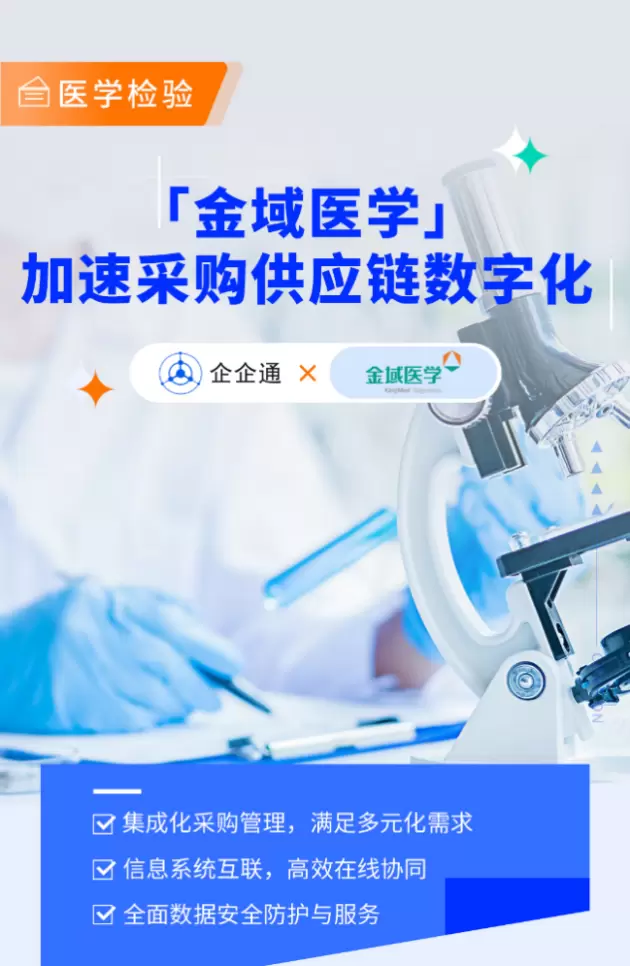 医检行业的供应链中,涉及到检验设备、试剂、耗材的采购、储存、使用等多个关键环节。金域医学为更好地优化整体运行效率,经过多方考察和选型对比,金域医学最终选择了具有良好行业口碑、拥有成熟医药服务行业客户案例的企企通作为合作伙伴。