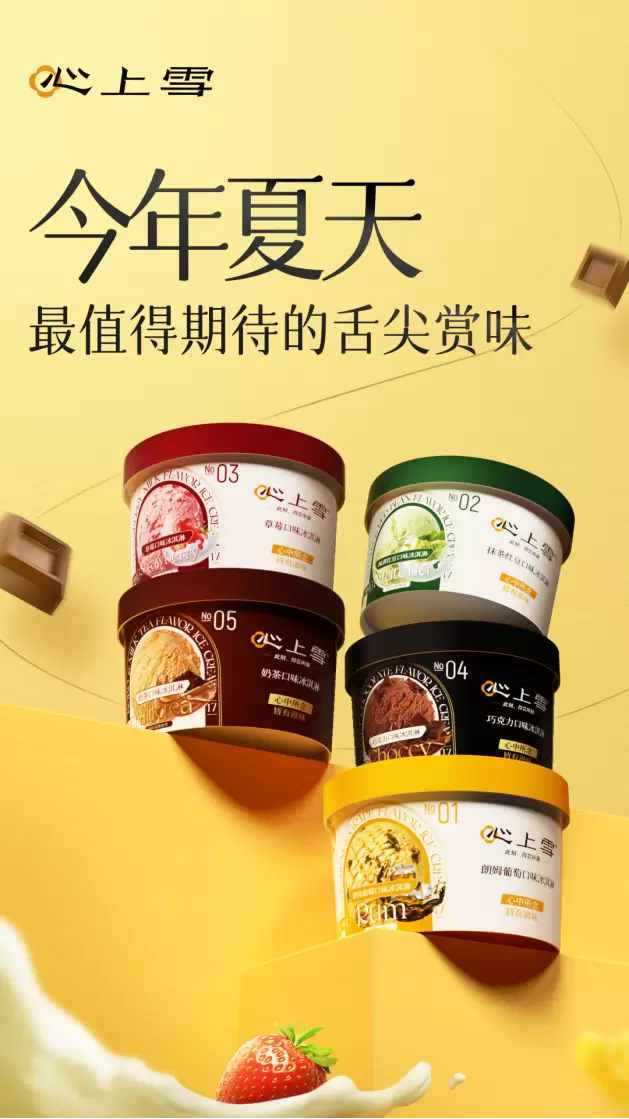 心上雪洞察到消费者们对冰淇淋的品质和健康追求后,推出了心上雪品牌高端冰淇淋系列,从产品配方、生产冷链到原料食材全方位秉承高标准、高要求原则,立志为消费者带来优质的冰淇淋品鉴体验。