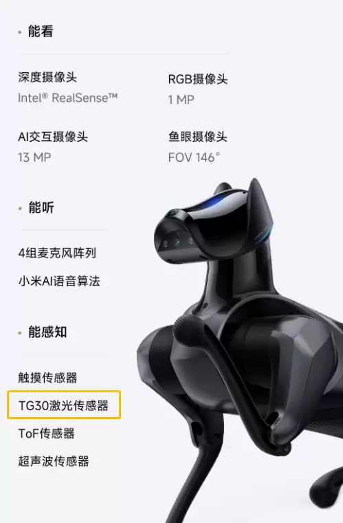 在这款智能萌宠CyberDog 2的核心零部件展示中,由深圳玩智商科技有限公司(简称:EAI科技)自研的明星产品“YDLIDAR TG30激光雷达”作为其主雷达,在演讲中进行了标名介绍。