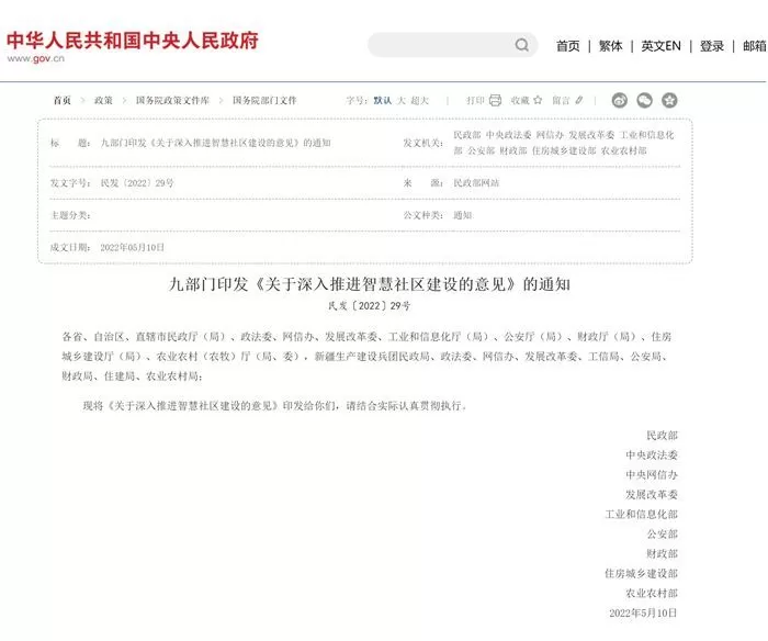 2022年5月,民政部、住房和城乡建设部等9部门印发《关于深入推进智慧社区建设的意见》(以下简称《意见》),其中明确“智慧社区”概念,确定6大智慧社区建设任务,提出建设目标,即到2025年,基本构建起网格化管理、精细化服务、信息化支撑、开放共享的智慧社区服务平台,初步打造成智慧共享、和睦共治的新型数字社区。