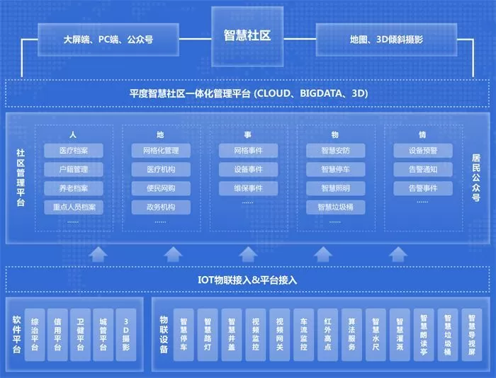 通过大数据、AI、IoT技术,贯通社区、小区多级架构,对人口、车辆、综合治理、社区工作、物业服务等数据进行综合分析和决策。
