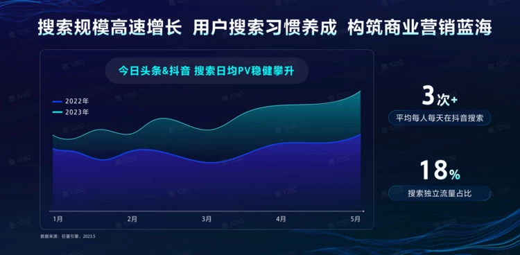 根据官方信息显示,2023年,用户平均每人每天在抖音搜索3次+,搜索独立流量占比18%。