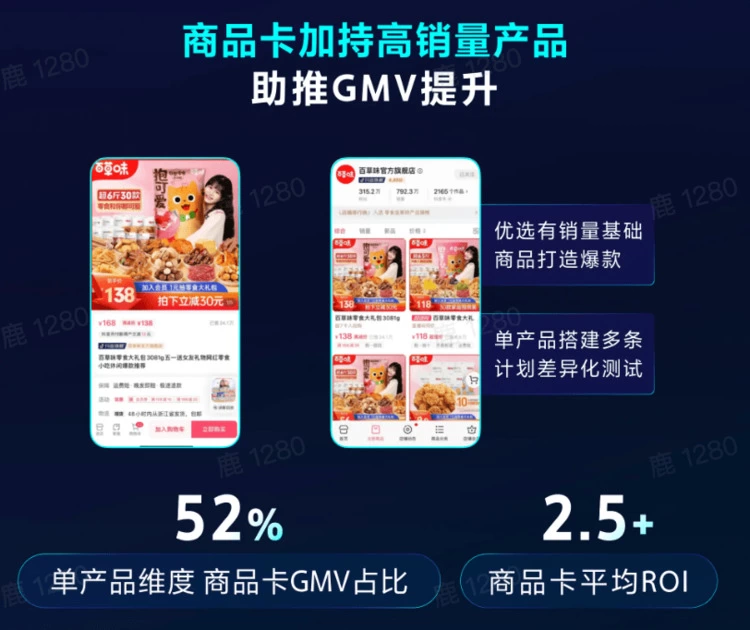 比如,百草味就通过【商品卡】获得了GMV的稳步提升。店铺百草味优选了有销量基础的商品进行投放,使用【商品卡】推广后相较于使用前,周均GMV提升了110%。