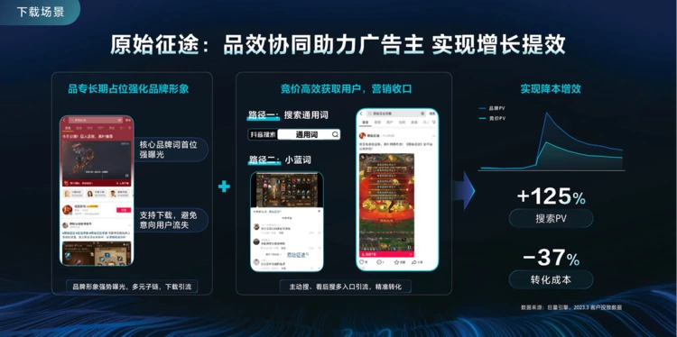 比如今年的新款手游《原始征途》,就选择了搜索品专和搜索竞价的组合,利用搜索框和评论区的搜索入口做人群覆盖,借助品专强势曝光塑造品牌形象,推广期内实现了搜索pv增长125%,同时考核成本降低l37%,实现稳妥的降本增效。
