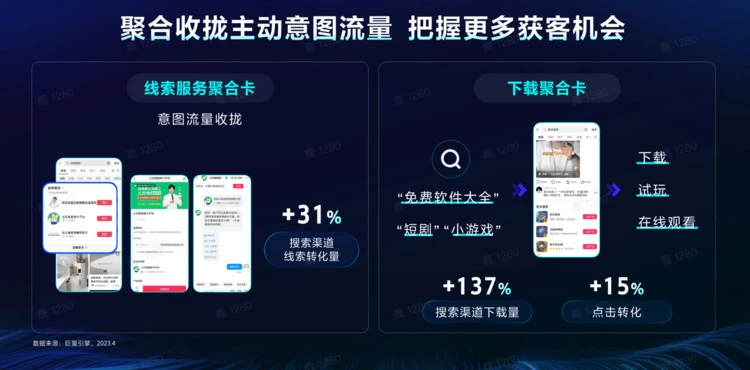 比如【下载聚合卡】,聚焦短途即刻体验,承接用户搜索后下载、试玩、在线观看等行为,以深化搜索广告的转化效率。