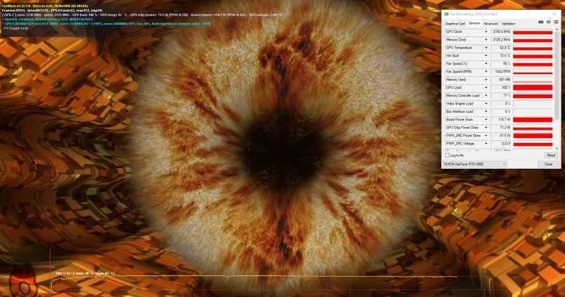 通过使用FurMark软件的测试功能,对耕升GeForce RTX 4060 星极皓月进行了一段时间的全负载测试。在大约20分钟后,当GPU的温度和功耗数据趋于稳定时,耕升GeForce RTX 4060 星极皓月的满负荷数据一目了然。可以明显看到,GPU的负荷温度仅为62.9度,满负荷功耗为118.7W。在GPU工作于满负荷功耗的情况下,耕升GeForce RTX 4060 星极皓月在保持优秀散热器和散热架构的前提下,实现了出色的负载温度并达到了令人瞩目的能耗数值。