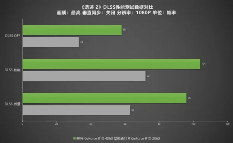 通过数据可以观察,关闭DLSS技术时,耕升 GeForce RTX 4060 星极皓月与GeForce RTX 2060之间差了25帧。而开启DLSS 技术后,两张显卡的性能差距更为明显。我们可以看到,在《遗迹2》中,耕升 GeForce RTX 4060 星极皓月在开启DLSS 性能模式的情况下,帧数来到了不错的104帧。在DLSS质量模式下,画面质量得到一定提升的同时,耕升 GeForce RTX 4060 星极皓月也保证了游戏的流畅运行,达到96帧,耕升 GeForce RTX 4060 星极皓月较比GeForce RTX 2060的提升幅度高达30%。可见在DLSS 技术的强力性能支持下,游戏帧数的提高,让玩家获得更加稳定流畅的游戏体验。