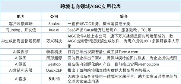 据相关机构预测,到2025年,全球跨境电商市场规模将达到惊人的16.93万亿美元,市场前景可谓一片光明。在这样的大背景下,AI厂商纷纷投入相关应用探索,以期在这个广阔的市场中分得一杯羹。目前国内厂商主要从运营及营销内容生产、用户反馈、独立站开发三大方向着手进行相关探索,代表性品牌包括万兴科技、Shulex、QuickCEP、Kua.ai等