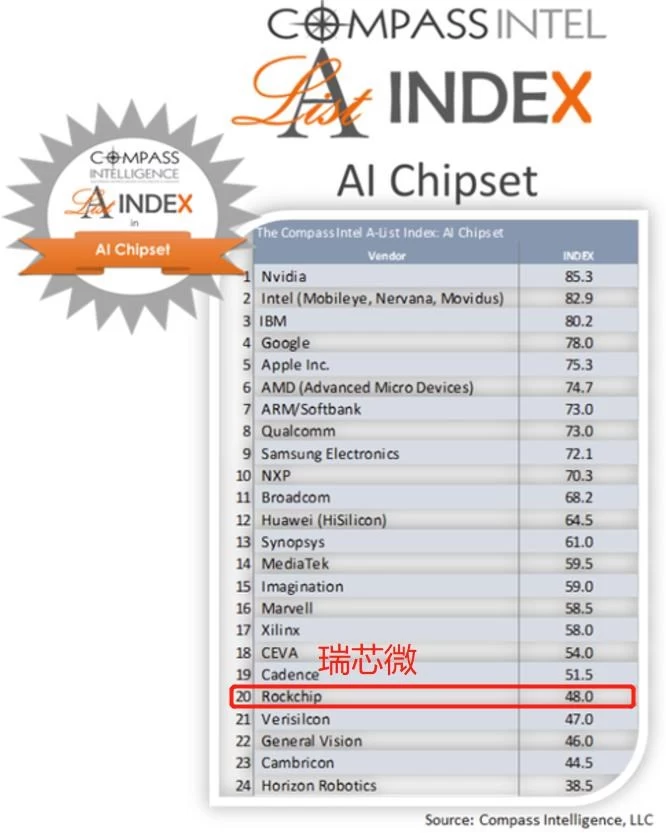 前段时间,市场研究公司Compass Intelligence通过公司表现、产品表现、市场表现、独特市场四大维度的计算,发布全球AI芯片企业排名。在全球前20名的AI芯片企业排名表中,瑞芯微赫然在列。