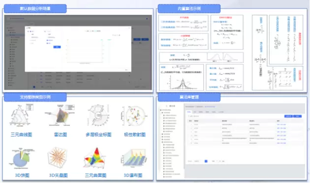 搭载丰富的算法集(包括200多种内置算法&支持自定义算法开发),采用机器学习和深度学习框架,可智能完成数据预处理、数据统计分析、数据表达式计算、分类、聚类、回归、特征提取及基于业务模型智能生成测试报告等;同时,支持结构化数据充分二次分析挖掘,以及来自产品研发、测试、运维等不同领域工程师在统一平台上整合资源、利用各类试验数据,大幅提升数据价值。