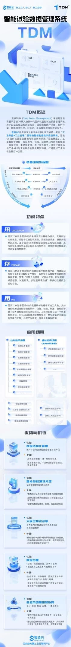 试验数据是企业的重要知识资产,企业需要建立大容量、高可用性试验工程数据库来统一存储各类型数据,还要具有完善的试验数据获取能力,方便试验数据存取使用;另外,随着试验的不断推进和研究的进一步深入,从大量的试验数据中分析、挖掘出有价值的知识,是试验数据管理的关键与难点。而这正是雪浪云基于雪浪OS搭建雪浪TDM的原因。