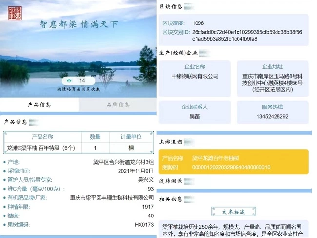 区块链公共溯源平台主要面向工农业产品溯源场景,结合区块链和物联网技术,可信采集并记录商品从原产地到消费者的全生命周期每个环节的重要数据,保障数据的不可篡改和隐私保护性,实现商品全流程溯源和问题商品精准追踪。重庆市梁平区龙滩柚使用区块链公共溯源平台建立连接种植基地、生产加工、产品包装、批发、物流、销售等供应链各环节企业及监管机构,共同建立溯源应用链。消费者通过扫描二维码,即可获得龙滩柚从种植到销售全生命周期各环节真实数据,提高品牌可信力的同时,消费者也能够购买到安全、放心的农产品。