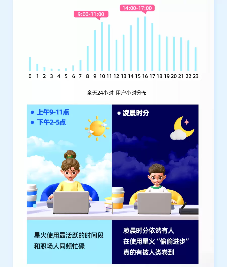 你是否发现了什么小规律?没错,这两个时间段是工作日最繁忙的时间段,销售精英在制作提案PPT一筹莫展的时候,只要用PPT大纲助手就可以理清思路;创业公司老板要开辟新项目时,先用商业文案助手打个样,提前了解下行业前景;还有周报小助手简直是职场人的助攻神器,明明都工作一周那么累了,就让星火去帮你奋笔疾“梳”吧。