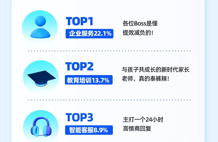 果不其然,PPT大纲助手、商业文案助手和周报小助手都以极高的人气,成为了热门助手榜的TOP3。后面还有几项新兴行业的助手值得一提,比如短视频脚本助手、小红书种草文案助手、故事创作助手以及标题小达人。这些助手都为新媒体时代的内容创作提质增速和减负,视频创作者不用再苦思冥想一个创意视频的故事梗了,图文创作者也不用再为取一个好标题而绞尽脑汁,只要给星火一个点子,它就能点石成章。