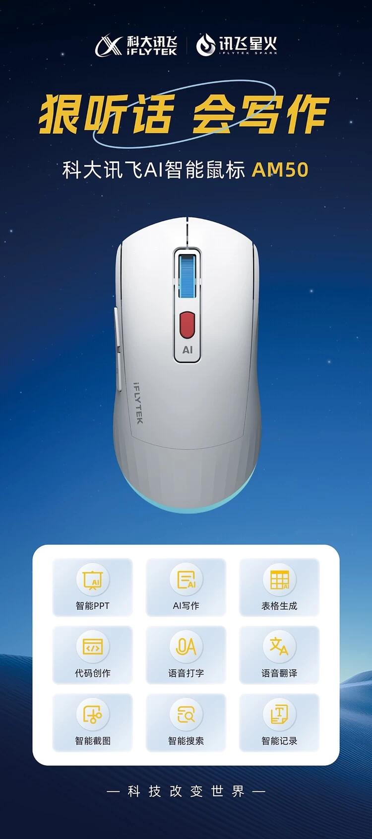 科大讯飞AI智能鼠标AM50酷炫来袭 搭载讯飞星火认知大模型能听会写