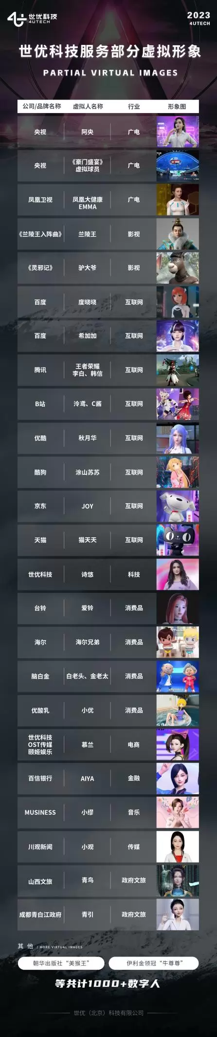 相关数据显示,下表为部分世优科技服务虚拟人。