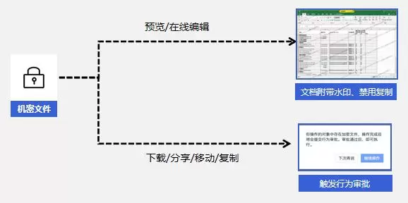 针对云端文件,文档上传至网盘涉密区域后自动加密,用户敏感行为自动触发审批;