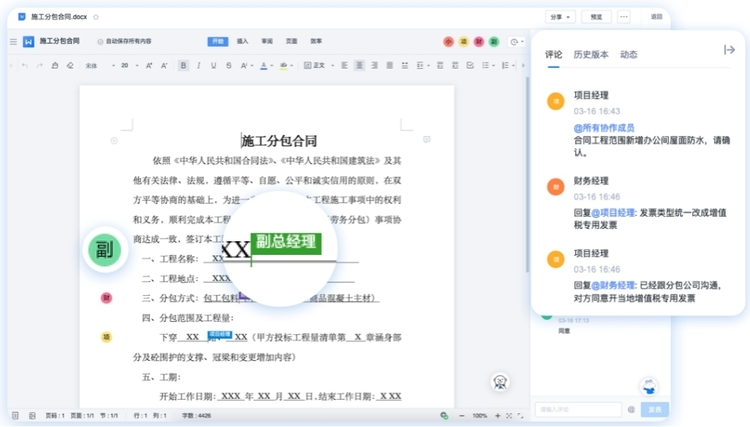 360亿方云支持多人同时在线编辑同一份文档,一个团队成员修改了共享文档的内容后会时时同步给其他人,云端文件修改后自动同步至本地,本地文件修改后也自动同步至云端,保证各成员之间的文件版本一致。大家也可以对文档进行在线批注和评论,评论消息实时提醒,大大提升协同办公效率。