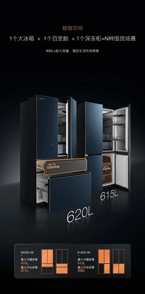 其中,-40℃的深冻柜容量为103L,与市面上大多数冷冻柜的容量无异,相当于多了一台小冻柜的同时,还不用额外占地方。-18℃到7℃的变温锁养舱,不仅实现每度可精准调控,而且整台冰箱最大使用冷藏容量512L、最大冷冻容量206L。无论是整体容量、冷冻温度还是收纳,天墅冰箱都能完美满足一家人的使用需求。