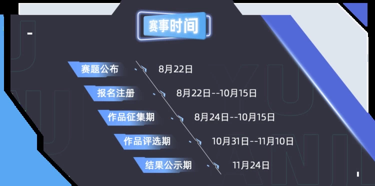 本次大赛持续时间从 2023年8月22日 至 2023年 11月24日,大赛由“平面创意”和“3D互动”两大创作赛道组成,面向全社会人士发起招募,在校学生、职场人士、自由职业者均可报名参加。
