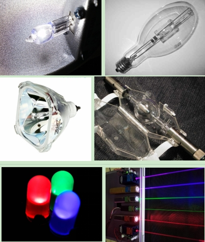 (从上至下、从左往右依次为卤素灯、金卤灯、高压汞灯、氙灯、LED、固态激光)