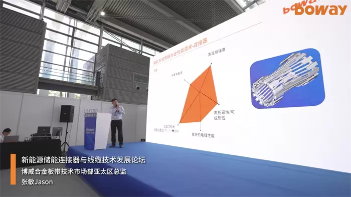 博威合金板带技术市场部亚太区总监张敏Jason以《新能源应用场景下的铜合金关键特性》为题,重点阐述了博威合金不同性能合金材料,在新能源储能连接器、高压连接器等应用上的设计考量。精彩的演讲,赢得了现场大咖们的高度认可。