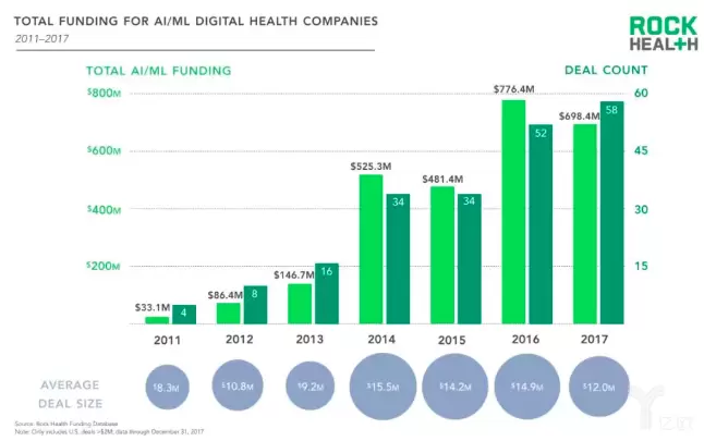 目前,许多令人兴奋的人工智能改变医疗领域的事件正在上演。人工智能技术正在涌现,帮助人们将管理和临床医疗流程化自动化。根据风险投资公司Rock Health的数据,2011年至2017年间,有121家与健康相关的人工智能/机器学习公司在206笔交易中募集到了27亿美元。