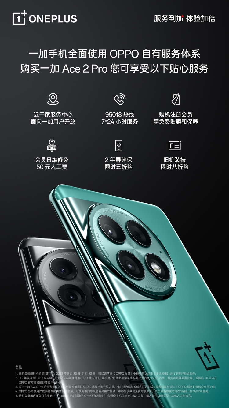 一加Ace 2 Pro 不仅拥有极致性能,新机服务权益也很亮眼。自2022年一加全面接入OPPO自有服务体系,一加用户可享由OPPO服务提供的线上线下多样化服务。线下全国近千家OPPO服务中心面向一加用户开放,用户到店可享贴心有情谊的服务。线上可享7*24小时热线服务,随时随地一键召唤给用户提供不间断的服务;多达15个在线智能服务入口,提供全天候的智能自助交互和人工服务。