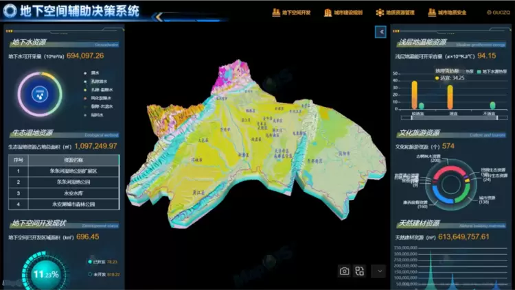 通过城市地下空间资源地质调查工作,实现对成都市域内浅层地热能、地下水、天然建材、地下空间开发现状、生态湿地、文化和旅游等资源分布情况进行综合管理,城市地质信息系统平台和地下空间政府决策服务应用平台的建立,实现资源情况可查询、可统计、可展示,定向支撑相关部门对自然资源管理,促进地热资源合理开发利用,为资源的协同开发与保护提供决策性建议。