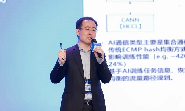 华为网络技术实验室主任刘冰洋在《面向端边网云协同的网络技术研究》主题演讲中,首先介绍了云网边端协同创新架构,包括云网统筹调度、端网协同传输等技术体系,以弥合当前网络架构存在的“垂直割裂”和“水平割裂”两大问题,保障端到端差异化业务体验。然后介绍了AI计算网络大带宽接口、大容量交换、低成本架构、高效率通信等方面的基础突破与跨层协同思路,包括通过构建拓扑亲和计算技术体系将物理带宽最大化转化为业务吞吐、通过拓扑创新降低网络成本和功耗等,以系统提升通信效率,打造高性能的AI算力底座。