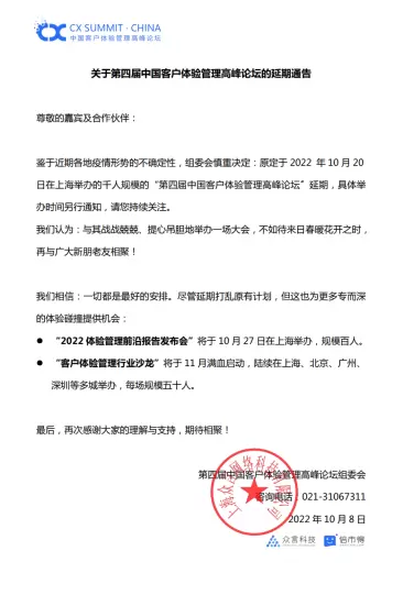 2022年10月8号,在经历了太多不确定因素的挑战后,大会组委会最终发布了一则延期公告,体验论坛不得不停下脚步。