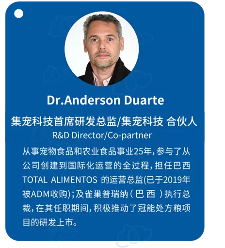 从事宠物食品和农业食品事业25年,参与了从公司创建到国际化运营的全过程,担任巴西TOTALALIMENTOS 的运营总监(已于2019年被ADM收购);及雀巢普瑞纳(南美区)执行总裁,在其任职期间,积极推动了冠能处方粮项目的研发上市。