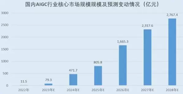 据iiMedia Research数据,2022年,国内AIGC行业核心市场规模为11.5亿元。预计2023-2028年,国内AIGC行业核心市场规模分别为79.3亿元、471.7亿元、805.8亿元、1,665.3亿元、2,317.6亿元、2,767.4亿元。