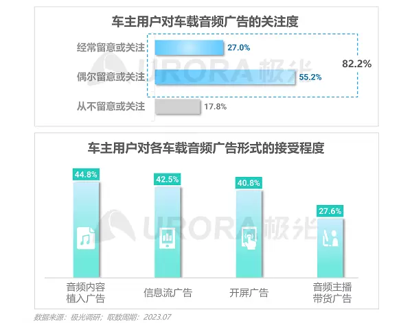 商业潜力:八成以上车主有留意或关注车载音频广告,车主对音频植入广告的接受度更高