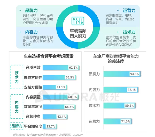 • 从用户端来看,技术力和内容力成为用户选择车载音频平台的重要考量能力;从车企端来看,车企厂商更关注平台的品牌能力