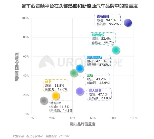 车载音频平台在燃油和新能源品牌中的覆盖度呈现差异化,喜马拉雅在不同品牌中的覆盖度均超九成