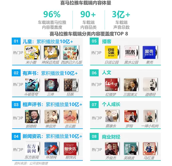 • 喜马拉雅车载端延续强大内容力基因,涵盖超3亿条声音和超90个音频品类,构筑丰富品类生态,为音频用户提供多样化、优质化内容服务,八大品类的热门IP在车载端累积播放量均已突破千万
