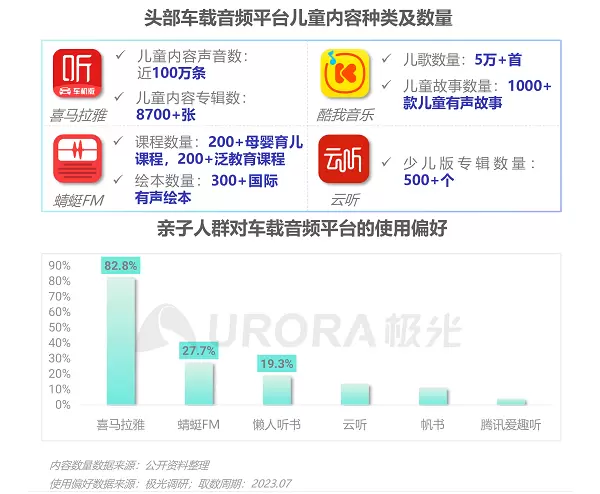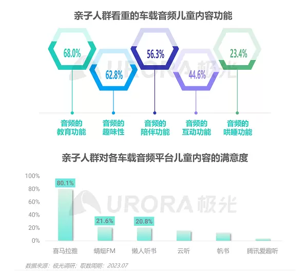 • 对比各车载音频平台在儿童内容上的表现,喜马拉雅收获最多亲子人群的认可,满意度达80.1%,列行业第一