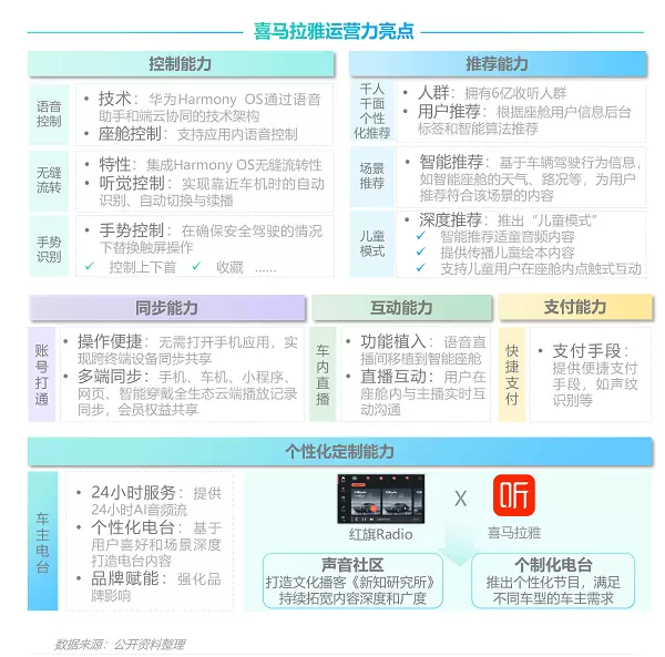 • 喜马拉雅车联网核心运营力凸显,从用户到车企满足差异化需求,在控制、推荐、同步、互动、支付以及个性化体验上深度运营,提升智能座舱体验,赋能车企品牌扩大影响力