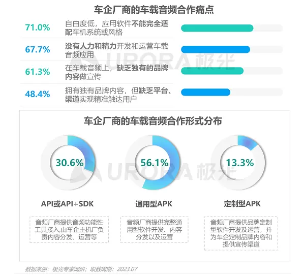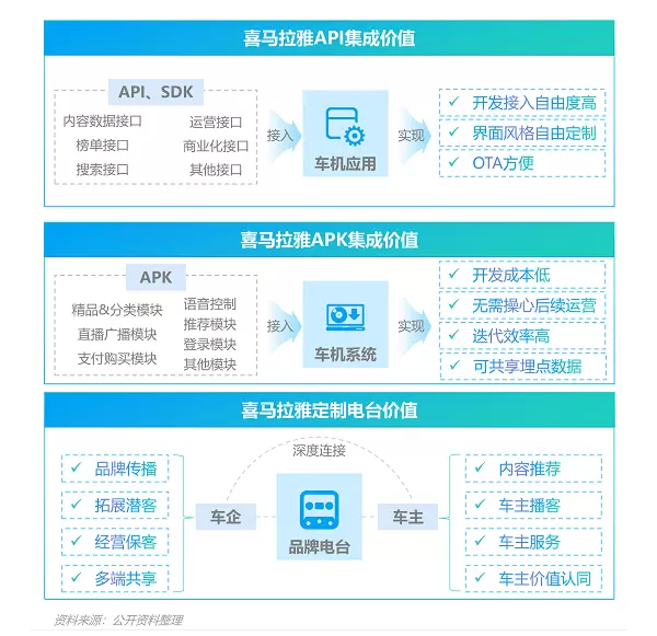 • 车载音频厂商为车企提供完整的接入解决方案成为了最普遍的合作形式,通过通用型APK的接入,音频厂商能够提供音频软件开发、内容分发以及运营等