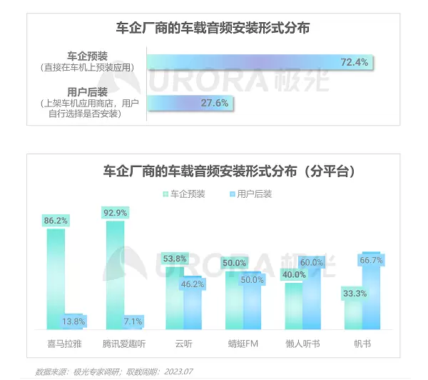 • 72.4%的车企以车机预装的形式安装车载音频软件,用户后装方式的占比为27.6%