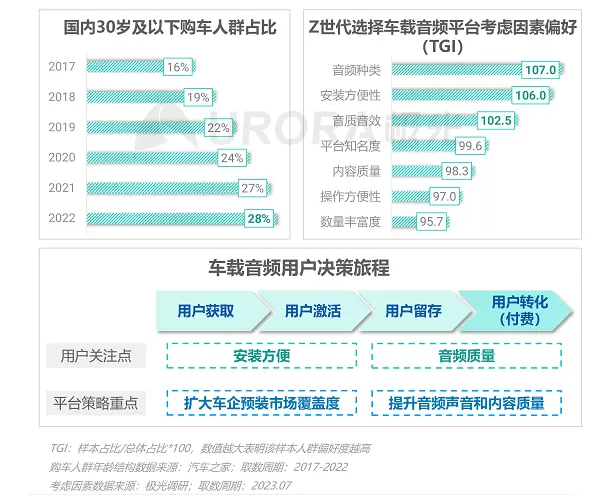 • 对比其他年龄段人群,Z世代选择车载音频平台时更关注平台是否已预装和平台的音质音效;对于新生代车载音频用户群体而言,在车载音频用户旅程上,预装成为获取和激活用户的关键因素,音频的品质质量则成为留存和转化的关键点