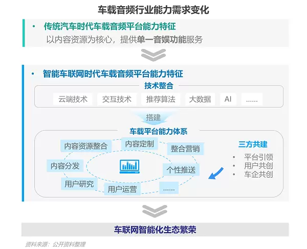 • 车载音频平台突破单一音娱功能服务,通过整合计算、储存、运营等技术,引入用户内容共创以及车企内容、运营、技术共建,打造更开放融合的能力体系,赋能车企智能车联网生态建设