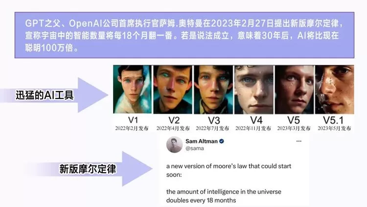 GPT之父、OpenAI公司首席执行官萨姆.奥特曼在2023年2月27日提出新版摩尔定律,宣称宇宙中的智能数量将每18个月翻一番。若是说法成立,意味着30年后,AI将比现在聪明100万倍。