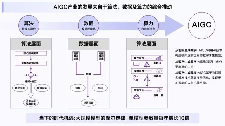 AIGC具备基于准确和规模化的数据,形成了学习、抉择、尝试、修正、推理,甚至是根据反馈修正行为的能力,这是一种可以突破线性思维框架,并且实现非线性思维推理的强大能力。我们高阶的思维能力,便是归纳、演绎、分析、应对复杂逻辑关系,AI向着机器学习、深度学习利用数据特征,在算力、计算训练层面,在算法层面,解决复杂场景挑战。这些深度学习、大模型(小模型)的创造应用,都意味着传统的创作互动模式转变为AIGC模型互动模式。