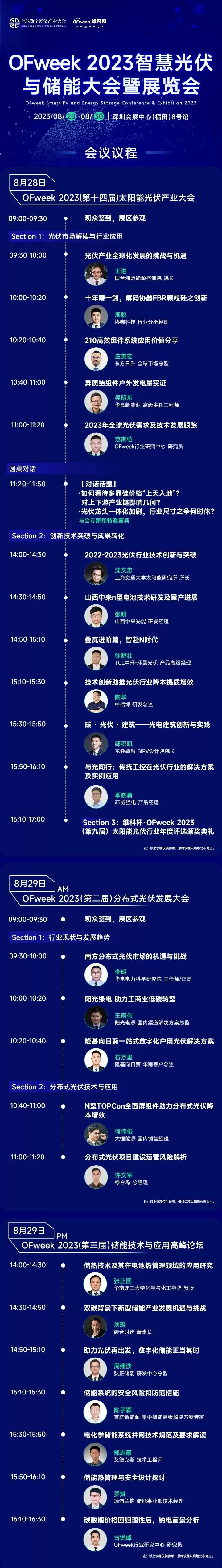 截止目前,现已确认出席企业有隆基绿能、阳光电源、首航新能源、东方日升、协鑫科技、华为数字能源、正泰新能、晶澳科技、锦浪科技、特变电工、阿特斯、禾望电气、协鑫集成、创维清洁能源、TCL光伏科技、国能日新、三晶电气、科士达、昱能科技、正泰智维、国瑞能、英威腾、麦田能源、晶科科技、一道新能、德业股份、安泰科、光至科技、清源科技、星辰天合、联塑班皓、润达光伏、爱康科技、海康机器人、保威新能源、英利源盛、金固美、英辰新能源、旗滨光能、阳光新能源、爱士惟、中信博、华晟新能源、环晟光伏、安正普、日托光伏、绿合岛、瑞浦兰钧、碳合时代、艾德克斯、瑞能股份、弘正储能等,众多明星企业还在持续更新中。