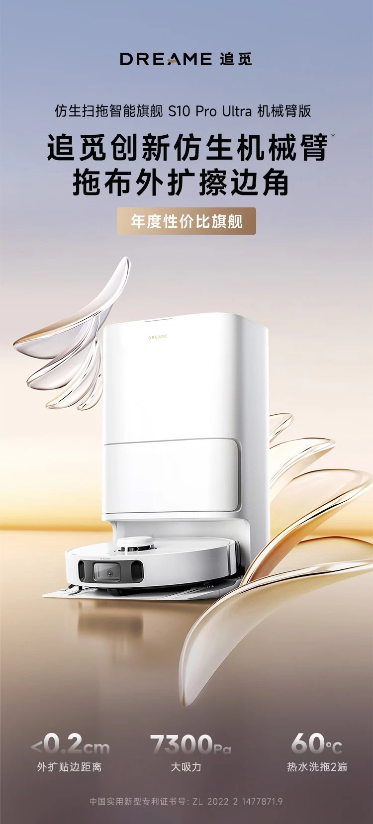 8月29日, 追觅科技发布了S10系列重磅新品——追觅S10 Pro Ultra机械臂版扫地机器人。最让人惊喜的莫过于追觅将其全球首创的仿生机械臂技术首次下放到三千价位段的S10 Pro Ultra机械臂版上,另外这款产品还搭载了行业顶级7300Pa超强吸力及行业首创主动式割毛防缠绕滚刷,清洁能力全面进化。仿生扫拖智能旗舰追觅S10 Pro Ultra机械臂版还拥有十项全能基站,60℃热水洗拖布等多项功能,带来极致的清洁体验。京东、天猫、抖音等电商平台追觅旗舰店现已同步上架,售价为3999元。