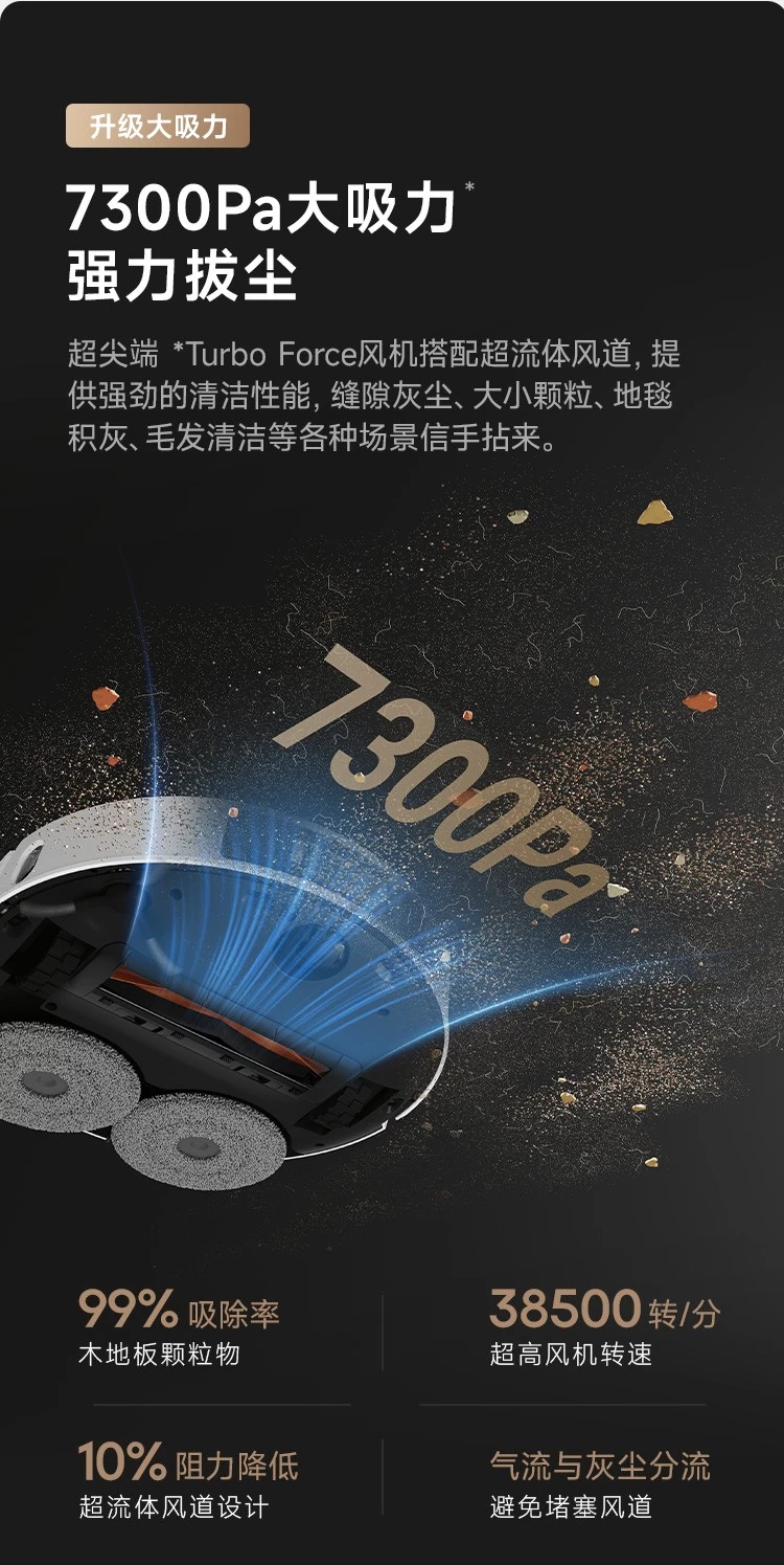 7300Pa强大吸力持久稳定,行业首创主动式割毛防缠绕滚刷,毛发清洁无忧