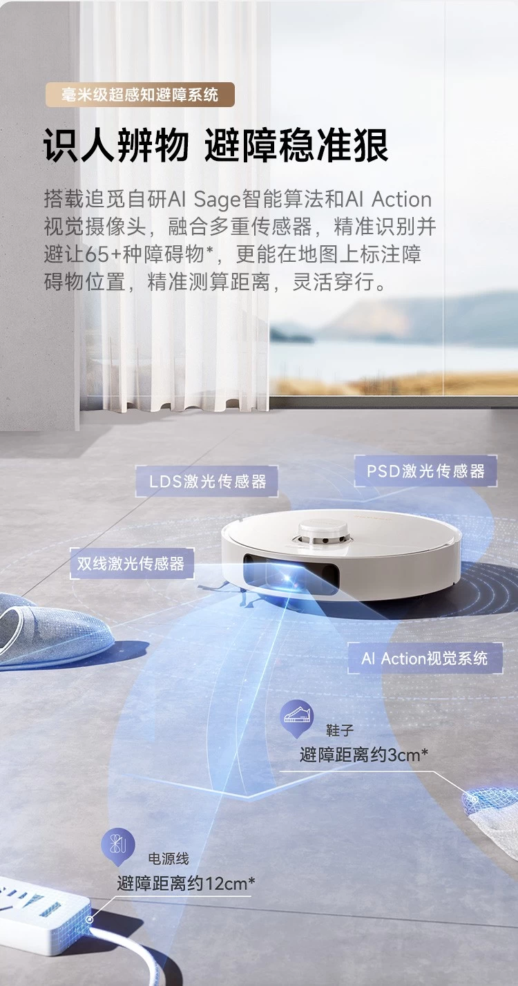 AIAction视觉摄像头+双线激光打造毫米级超感知避障,搭载无人驾驶引擎,完成家庭深度清洁