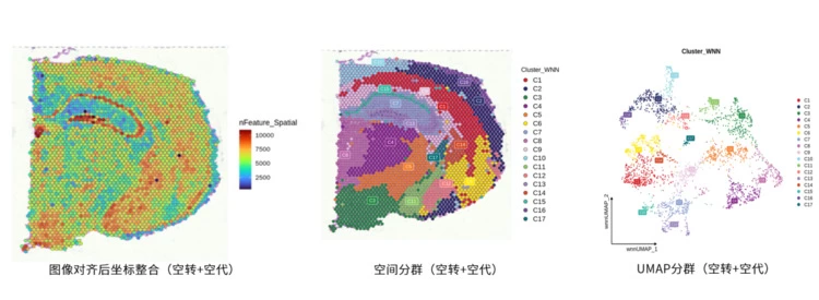 根据spot点信息,开发空间映射和高端整合对齐算法,获取多个维度信息,可实现空间代谢+空间转录+空间蛋白三组学或者两组学的联合方案,对数据进行深入的挖掘。部分实测分析内容展示如下: